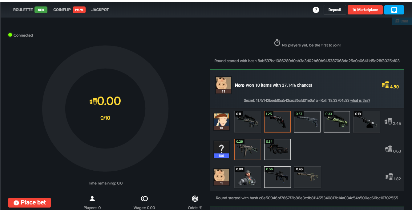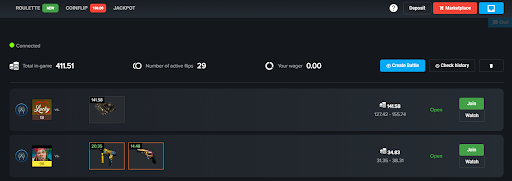 The user can choose from the following types: traditional casino roulette, classic coinflip, and jackpot. As for coinflip, everything is evident here – two participants put up items with a commensurate total cost, after which the random generator decides which of the two will be the winner and take everything. Or rather “almost everything” – for each such transaction, CSGOHunt, of course, charges a small commission. Accordingly, this mode is a regular bet on black or red in classic casino roulette – except for the fact that zero can never land on CSGOHunt. This model compares favorably with the fact that there will always be one winner in it.