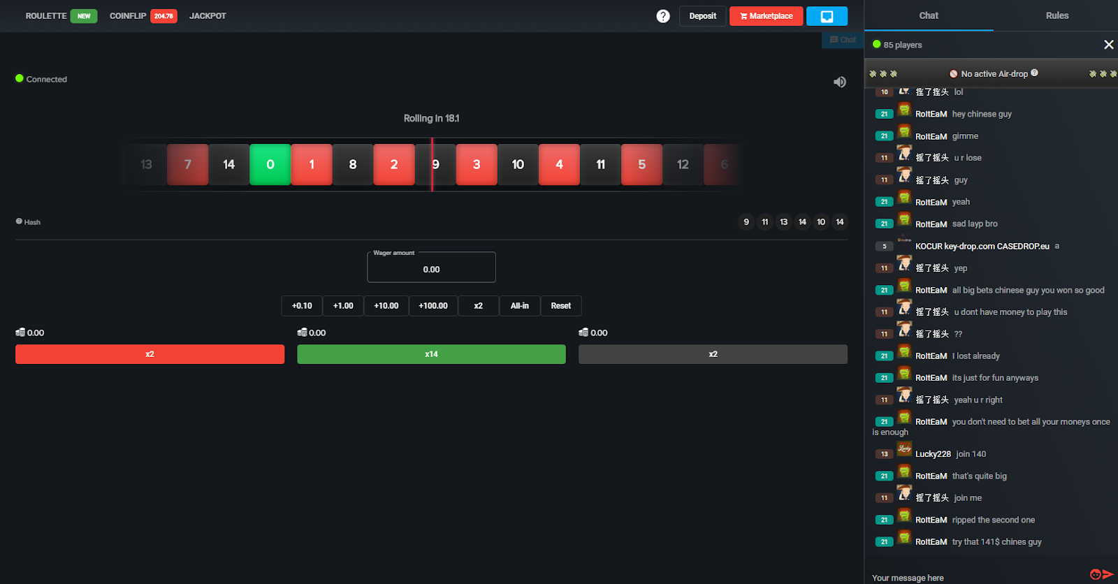 The next available mode on the CSGOHunt is the good old roulette. One of the most traditional and time-tested games both in a real casino and in all kinds of its virtual counterparts. The local variation is practically no different from all the others – you can bet on black, red, and zero. The factor for the first two options is x2. For “zero,” the local factor is x14.